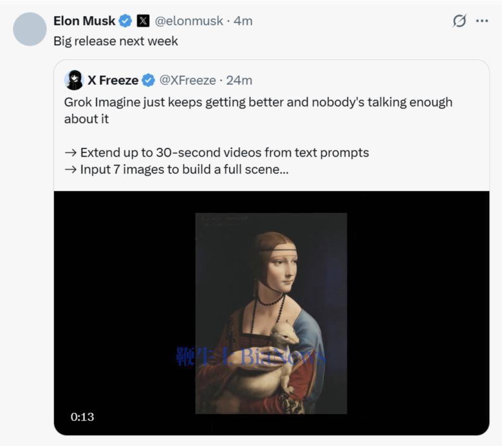 3月27日,埃隆·马斯克在X平台上预告表示,“Big release next week”,确认旗下AI模型Grok Imagine下周将有重大发布。